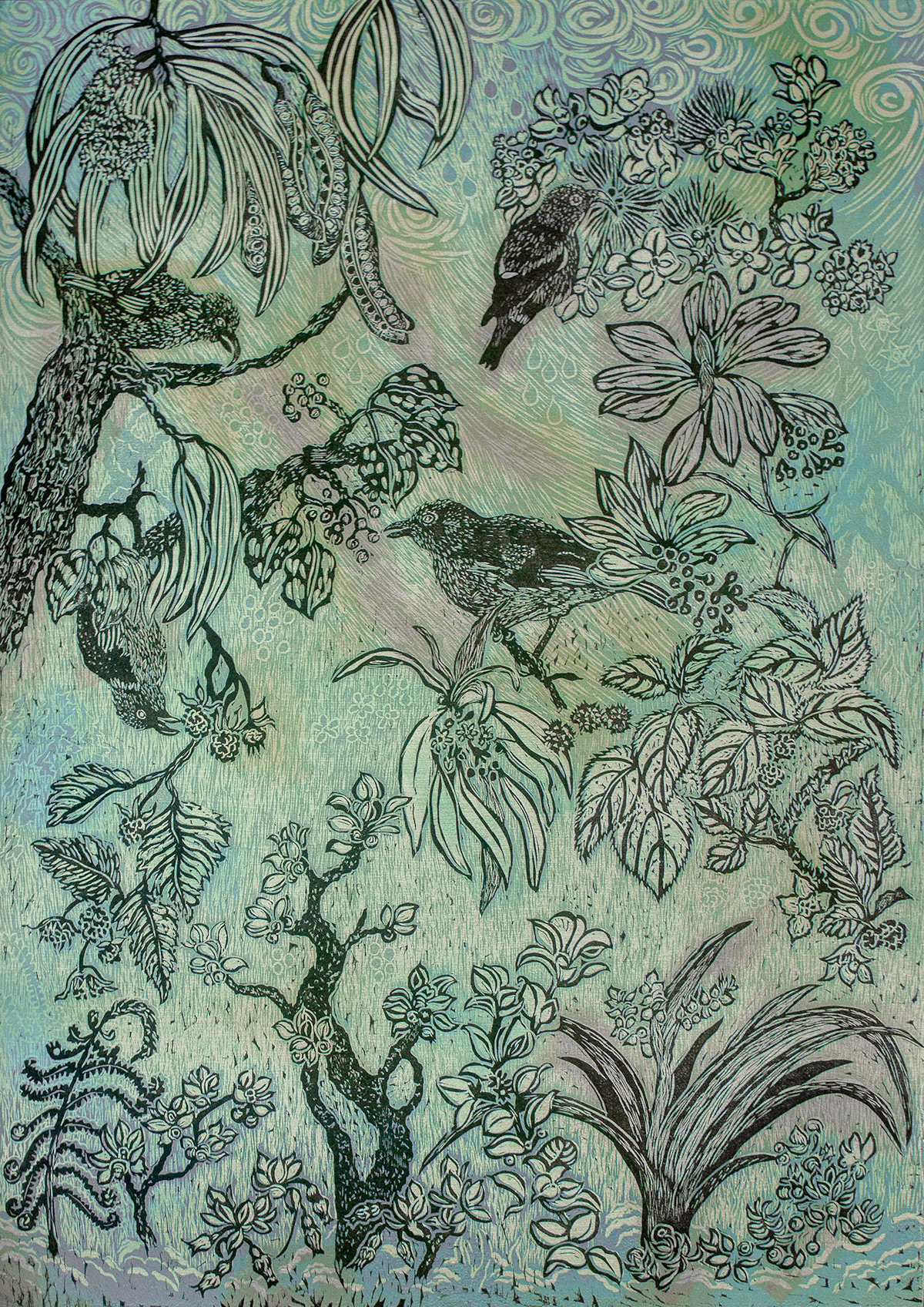 Special mahalos to my partner Joe for being such a wonderful companion in nature, and to K. Kuulei Kanahele (Perreira-Keawekane), Hawaiian cultural practitioner, for advising me on a fitting title for this print, which she expands upon in her Cultural Statement. K. Kuulei Kanahele is a consultant that regularly assists individuals and organizations with the re-indigenization of their practices and systems. She is a third-generation farmer who comes from the Keawekane family of Panaʻewa, Waiākea, Hilo, Hawaiʻi.